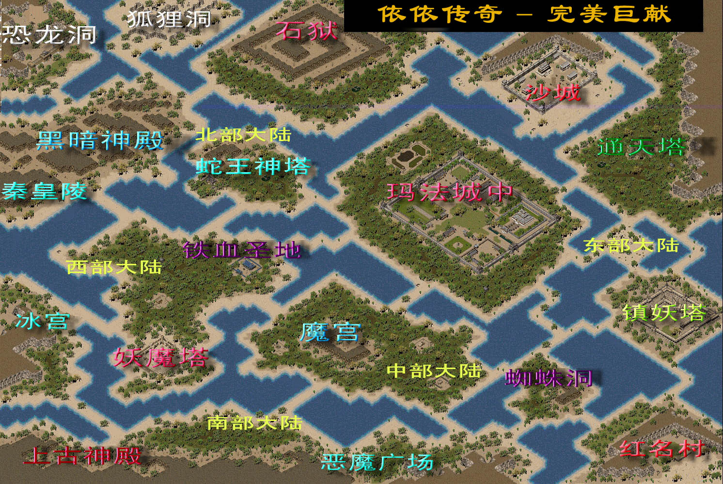 魔宫→镇妖塔→天之炼狱→蛇王神塔→邪魔广场→黑暗神殿→狐狸→石狱→妖魔塔→冰宫→秦皇陵→恐龙洞→蜘蛛洞→中土世界→铁血圣地→通天塔→卧龙山庄→上古神殿。