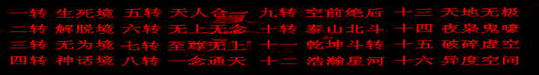 16转:360级,转生后攻击力4.3倍,送1000属性点,等级降到170级,最高可升400级,需要:上古仙桃10个、地狱之火10个、五色羽10个